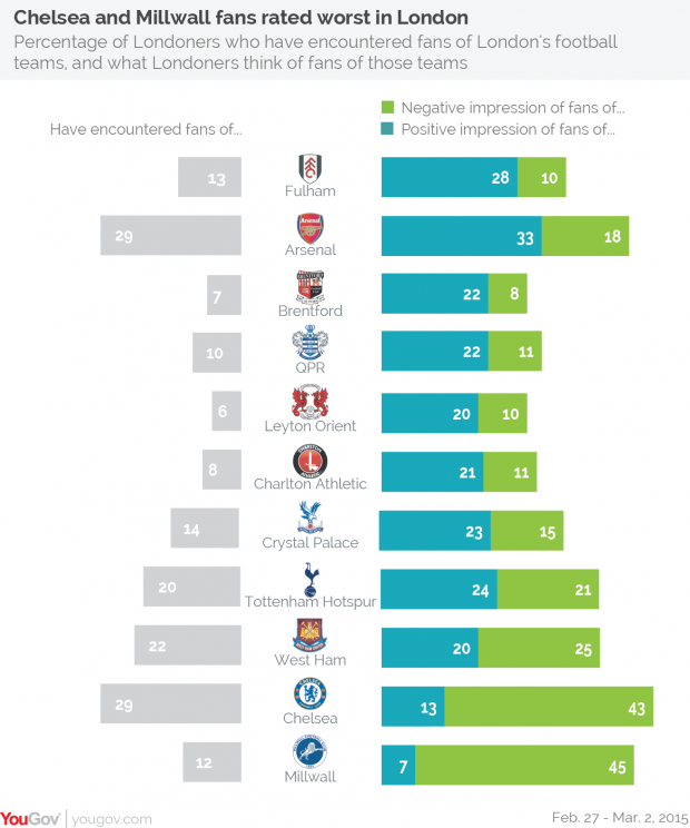 Millwall fans are hardly alone in eliciting a bad public image. Chelsea fans trail their Millwall counterparts by just two per cent with 43 per cent having a poor impression of the central London club.