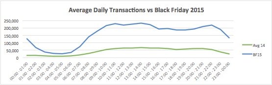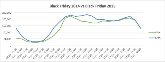 At some time periods in the day, such as between midnight and 1am, there was a mammoth 660 per cent increase in online activity using a normal day, in this case Friday 20 November (a week before Black Friday), as the benchmark.