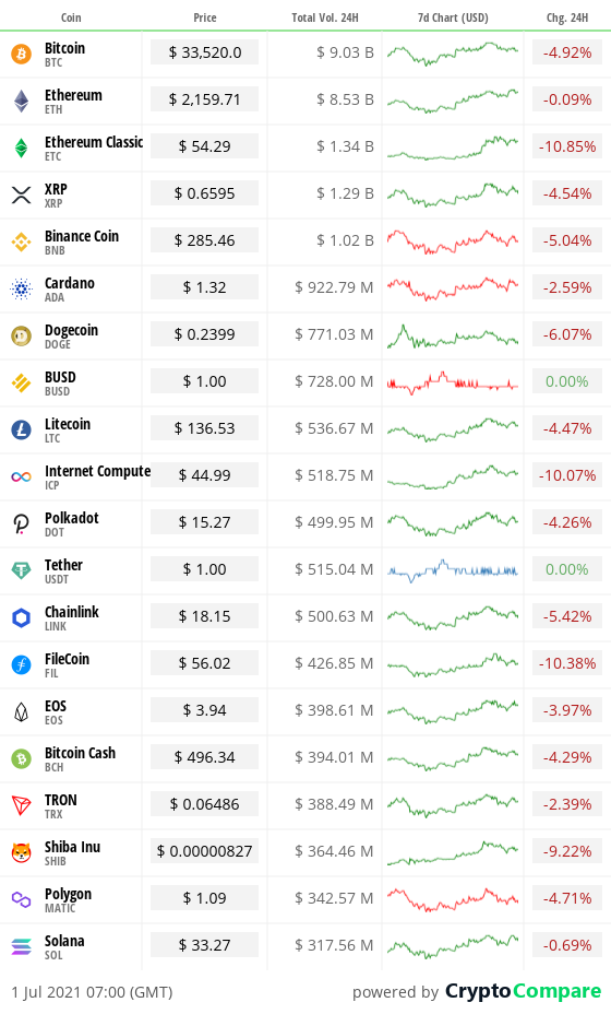 The news failed to do much for Bitcoin’s price fortunes, however. The leading cryptocurrency continued to hover around the $35,000 mark yesterday, and has fallen to around $33,500 this morning as it remains in that narrow range.