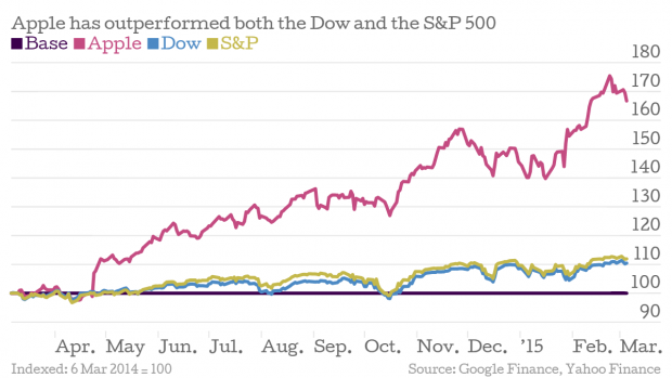 Apple has had a bumper year as the graph above shows. The almost hockey-stick trajectory of its share price makes the small gains made by the S&P 500, on which Apple is listed, and the Dow seem minuscule in comparison.