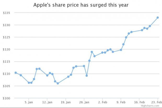 Apple's share price fell as much as 0.9 per cent to 131.44 in early morning trade, before paring gains to 133.5. Yesterday, it closed at a new record high of $133 per share, pushing the tech giant's market valuation to $770bn.