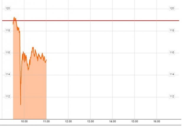 Shares opened at $118.80 at 9.30am EST, before suddenly experiencing a one-minute rush at 9.51am, with 6.7 million shares traded. During that minute, shares lost more than three per cent, and eventually fell as much as 6.4 per cent to $111.27. By 11am they had settled around $115, just over three per cent below their opening price.