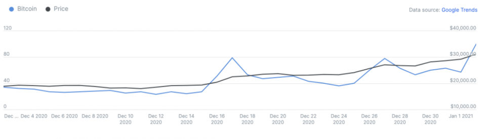 The trend in Google searches over the last 90 days. Google shows this chart on a relative basis with a max score of 100 on the day that had the most Google searches for that keyword. The latest score is 100 – taken from 2 January.