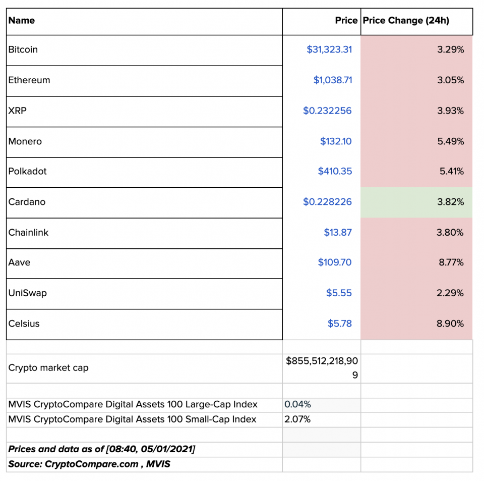 It was a turbulent day in the markets yesterday, with Bitcoin seeing a sharp retrace from $33,000 to $28,000 after Sunday’s new all-time high. The leading cryptocurrency by market cap managed to bounce back relatively quickly to over $31,000, where it has somewhat stabilised, but it could be a volatile few days ahead as the market figures out what it wants to do next. Such corrections are to be expected in a bull market, but traders should move carefully and also be aware of opportunities that could arise.