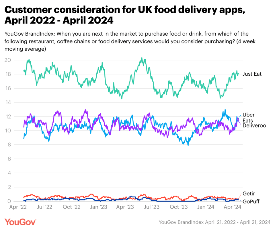 So how did Getir get here? YouGov BrandIndex data shows that, between April 2022 and April 2024, the brand’s Consideration scores, which measure whether consumers would buy from a particular delivery service, moved from 0.5 to 0.3 (-0.2).