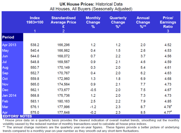 They dropped by 0.2 per cent, a small monthly decline. But on an annual basis, UK house prices are now up by 8.5 per cent in the three months to April.