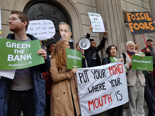 Activists protested outside the Bank of England this morning. (Source: Fossil Fuel London/Positive Money)