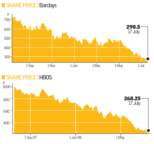 Even large institutions like Barclays and Royal Bank of Scotland have seen share prices plummet between 60 and 70 per cent over the last 15 months. Alliance & Leicester is down 80 per cent from its peak, and Bradford & Bingley is down 90 per cent. Even the strongest bank, HSBC, is down 25 per cent, over concerns about future profitability and margins. This week, banking stocks were at their lowest for 10 years.