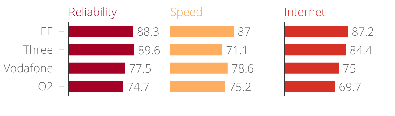 Three pulled ahead to have the best reliability, and its call and text performance has improved enough to make it runner-up overall, despite having slow network speeds.