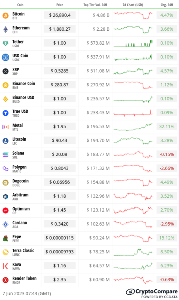 The leading crypto by market cap has clawed its way back to start the day at just under $27k – up more than 4% over 24 hours.