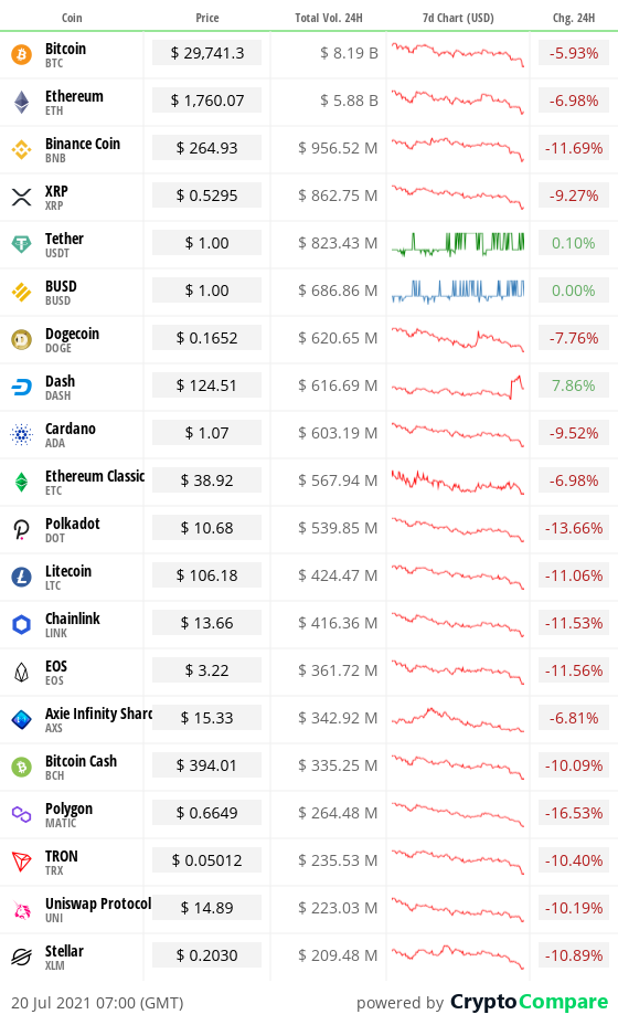Bitcoin slipped below $30k this morning for the first time in almost a month. It’s currently down five per cent over the last 24 hours, while alt coins including Ethereum (ETH) and Cardano (ADA) have seen even deeper crashes of nearer 10 per cent or more.