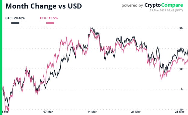 Over the last 30 days the price of Bitcoin moved up nearly 20.5%, while Ether went up 15.5%.