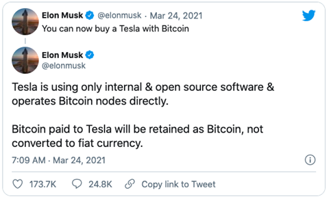On March 24, Tesla co-founder and CEO Elon Musk, announced on Twitter that the U.S. electric car maker is now accepting payments in Bitcoin in the US. Furthermore, unlike most people/companies that accept Bitcoin payments (usually, with the help of crypto payment processor BitPay), Tesla intends to keep all the BTC it receives rather than convert them immediately to fiat currency.
