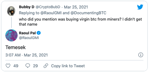 Pal revealed on Twitter that one of the sovereign wealth funds that has recently been buying Bitcoin is Temasek Holdings, which is owned by the Government of Singapore: