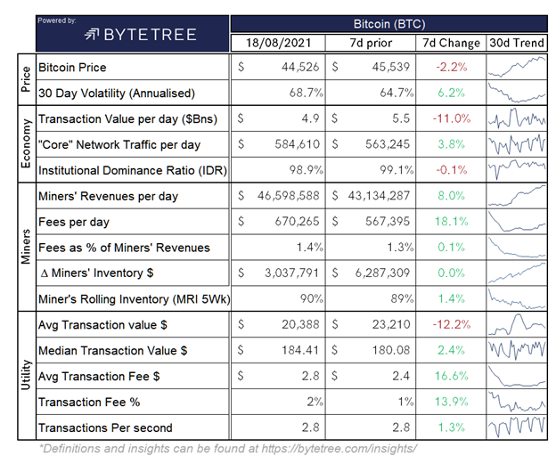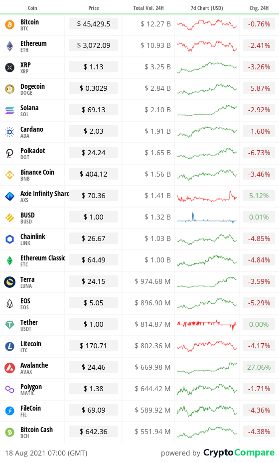 We closed yesterday, August 17 2021, at a price of $44,695.36 down from $46,004.48 the day before.
