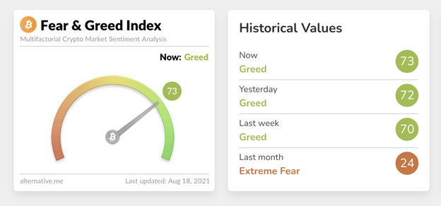 The two cryptocurrencies have been unable to push above resistance levels around $48,000 for BTC and around $3,300 for ETH. This is despite the ongoing positive vibes in the market, with the Fear and Greed Index that measures market sentiment continuing to sit comfortably in the “Greed” area. It has now been in the “Greed” area for more than a week, the first time it’s had such a prolonged streak since early May.