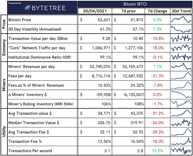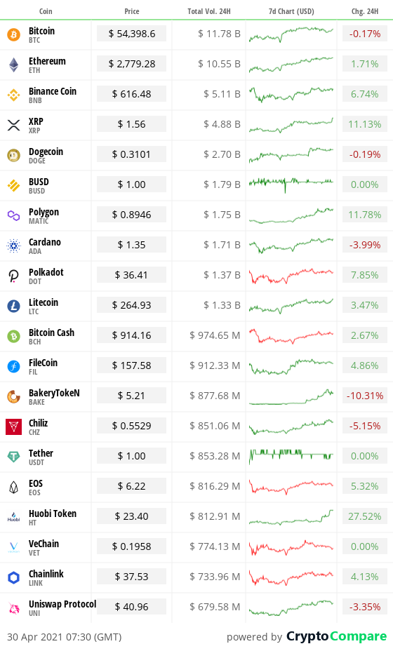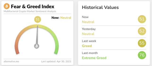 We closed yesterday, April 29 2021, at a price of $53,555.11 – down from $54,824.70 the day before.
