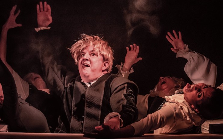 Director Patrick Marber, who has worked with Iannucci since The Day Today, has delivered a no-frills production (if you ignore the occasional ruff). The five actors who make up “the Pandemic Players” take on multiple roles, wearing doublets, hose adapted from Adidas tracky-bottoms, and – in one instance – a lurid green body-stocking. The set, such as it is, features a proscenium arch with a woodcut backdrop of a plague-afflicted Albion, two BEKVÄM step stools, and a hexagonal table with a trap door that functions as a swamp, an ICU bed, and ultimately a portal to Hell. Paul Chahidi wears Boris’ blond mop, and is entirely convincing as the bombastic but hollow Orbis, and Natasha Jayetileke’s puckish Riches captures the obsequious, self-serving essence of our current PM.