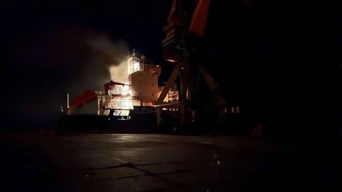 The Ukrainian Interior Ministry said the ship was struck during “shelling from the sea” by Russia, causing a fire in the engine room.