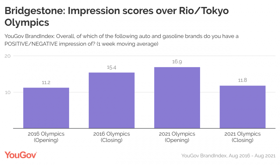But if Bridgestone is disappointed by the 2021 event, its performance in 2016 may remind the company that, under normal circumstances, a partnership with the Games can be an effective brand-building