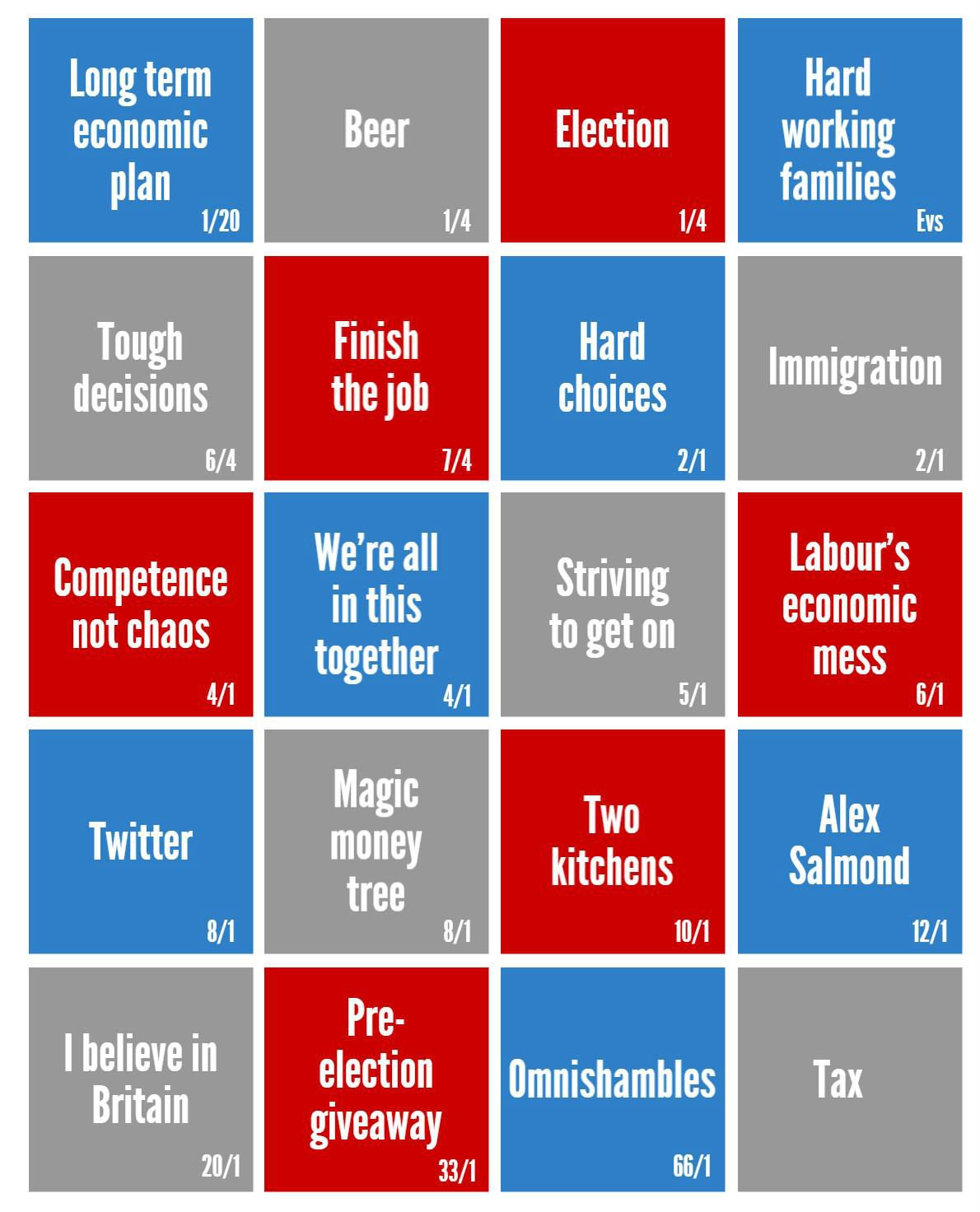 Matthew Shaddick of Ladbrokes said: "If the chancellor wants to arrange a pre budget giveaway, he just needs to stick a blue tie on. That would undoubtedly see a major redistribution of income from our pockets to those of Ladbrokes' customers."