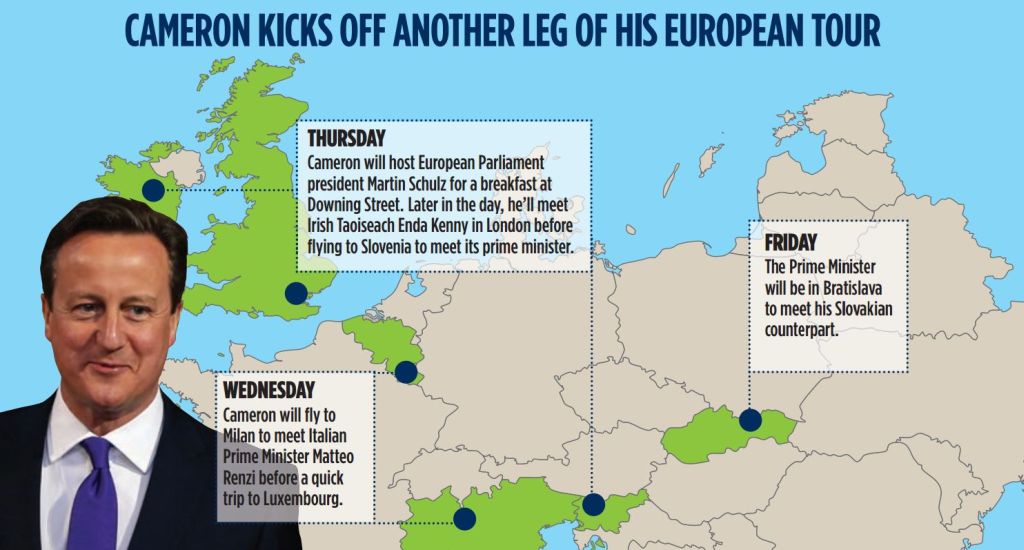 Cameron is due to visit Italy, Luxembourg, Slovakia and Slovenia later this week, as well as welcome the president of the European parliament and the Taoiseach (Irish prime minister) to London for bilateral talks. The Prime Minister has said that he hopes to meet face-to-face with each of his European counterparts ahead of next week’s European Council in Brussels.