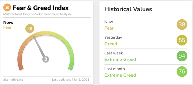 Market sentiment drops to 38 today, in Fear for the first time since January 22.