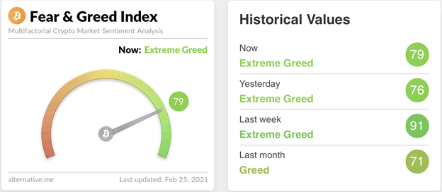 Market sentiment remains high at 79 today. We’ve spent fewer than seven days outside of Extreme Greed since November 2020.