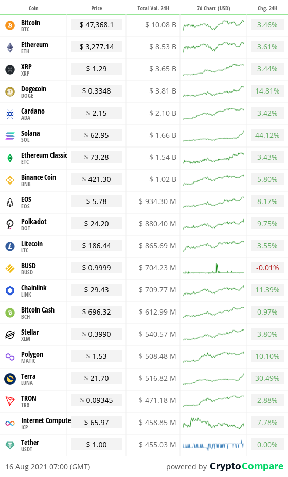 The big gainer this morning is Solana, which has soared into the top 10 by market cap this morning having gained 42 per cent over the past 24 hours. It’s currently trading for just over $60. Solana is the native token of the Solana blockchain – “an open source project implementing a new, high-performance, permissionless blockchain” – that employs an innovative proof-of-history consensus mechanism. Can it now establish itself in the top 10?