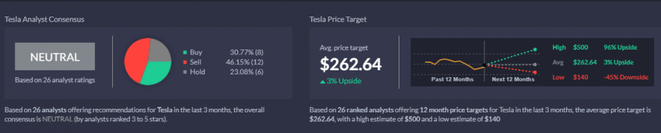 Our MARKETS.COM analyst recommendation tool suggests an average price target of $262.64, just about 3 per cent above where TSLA was trading on Tuesday. Of course Tesla splits opinions and the average masks a very wide range from $140 to $500 across the 26 Wall Street analsyts covered.