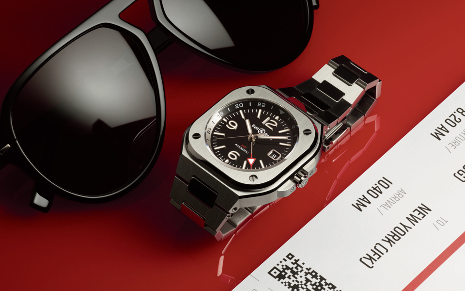 Paris’s monochromatically cool aviator brand, Bell & Ross dropped a bombshell in 2007: the BR 01 ‘Instrument’, so-named for its uncompromisingly squared-off allusion to fighter jet cockpit read-outs. Instantly adopted by pilots and hipsters alike, its bold geometry has become a sub-brand in itself, while never compromising on the watchmaker’s Swiss-made, professional- spec quality. And so, here we are, with a natural evolution that finds itself in line with the recent integrated-bracelet Seventies sports revival: the ’BR 05’. A more urbane, stylistically versatile take on ‘Instrument’, still in brutalist formation and now – just in time for our skies opening up again – in ‘GMT’ guise (£4,500). In other words, a fourth 24-hour hand keeping track of time back home, bringing a natty flash of scarlet to co-ordinate with your carry-on.