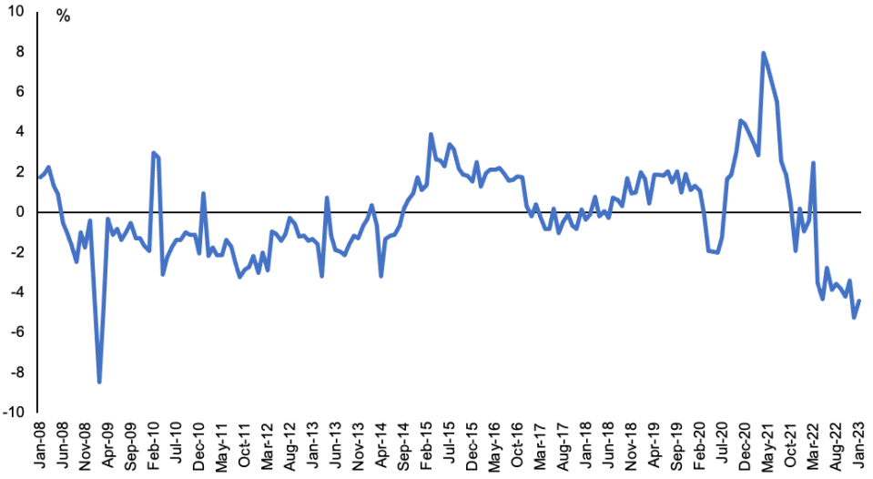 Real regular pay, which measures pay growth in cash terms minus inflation, fell on a monthly basis in January, according to the Office for National Statistics (ONS).