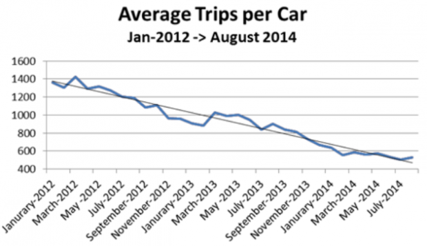 According to SFMTA director Kate Toran, who compiled the figures, the average number of journeys taken per cab has fallen from 1,424 in March 2012 to 504 in July.