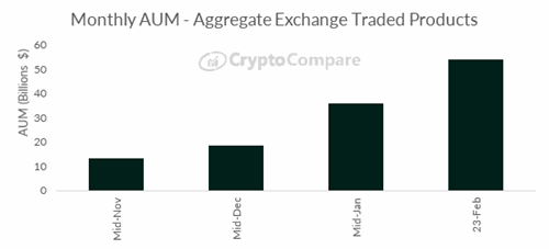 Despite Bitcoin’s new all-time high exceeding $58,000 last month, exchange-traded products (ETP) volumes decreased, with the average daily trading volume increasing from $1.51 billion to $936 million.