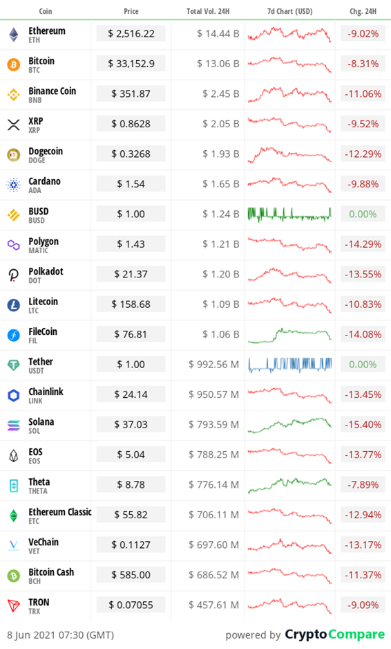 We closed yesterday, June 7 2021, at a price of $33,560.71, down from $35,862.38 the day before.