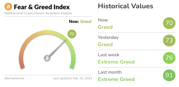 Market sentiment is back down in Greed at 70.