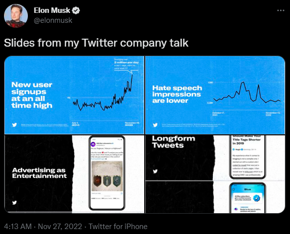 The movement coincided with Musk posting a collection of screen grabs he labelled as ‘Slides from my Twitter company talk’.