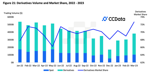 The report reveals that derivatives trading accounted for approximately 74% of the nearly $4 trillion crypto market volume in March. Although the majority of this trading occurred on centralised exchanges (CEX), decentralised exchanges (DEX) contributed $68.7 billion to the market.