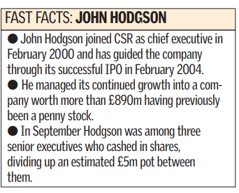 CSR’s share price has climbed by more than 15 per cent in the past fortnight. CSFB said the key issue for CSR remained 2006 revenues, noting that, while design contracts should ensure meaningful growth next year, the shares could suffer from some profit taking due to the seasonal downturn and the news of Hodgson’s departure.