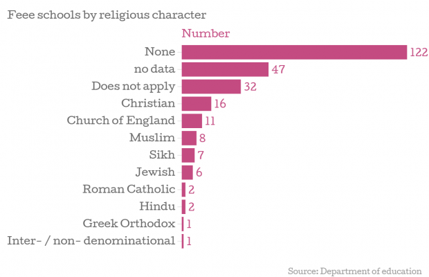 As the map shows, schools with religious characteristics are in the minority. Here is how they break down. All categories are untouched from the Department of Education definitions.