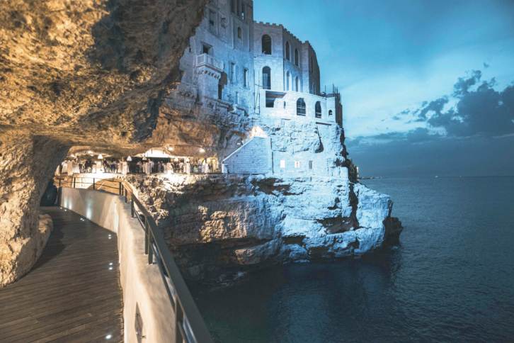 As we touch down at Bari airport I notice how flat the scorched earth of Puglia is. A good thing, too, because I’m not sure the Cinquecento could manage hills. I’m staying in the seaside town of Polignano a Mare, 30 minutes down the Achilles’ tendon to the south. Known as the Pearl of the Adriatic, it promises crystal-clear waters and cliffs pitted with caves. My accommodation sits atop the most epic of these, with its acclaimed restaurant housed in a grotto. The Grotta Palazese’s romantic location has been on the foodie map since 1964, but the hotel rising above it only opened last month. The view from its 15 bedrooms, directly above the cobalt blue and turquoise sea, is matched only by the spellbinding blue marble floor – inspired by the vista –stretching throughout the suite.