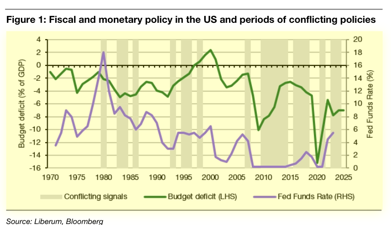 Liberum’s Joachim Klement argued the Federal Reserve may have to increasingly consider the impact of interest rate hikes on government debt, raising the risk that its independence could be undermined by fiscal dominance.