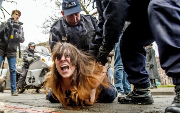 The former IMF chief was met with topless activists from the Femen protest group upon his arrival at the courthouse, one of whom tried to climb on his car and had the message "pimps, clients, guilty" scrawled across her chest.