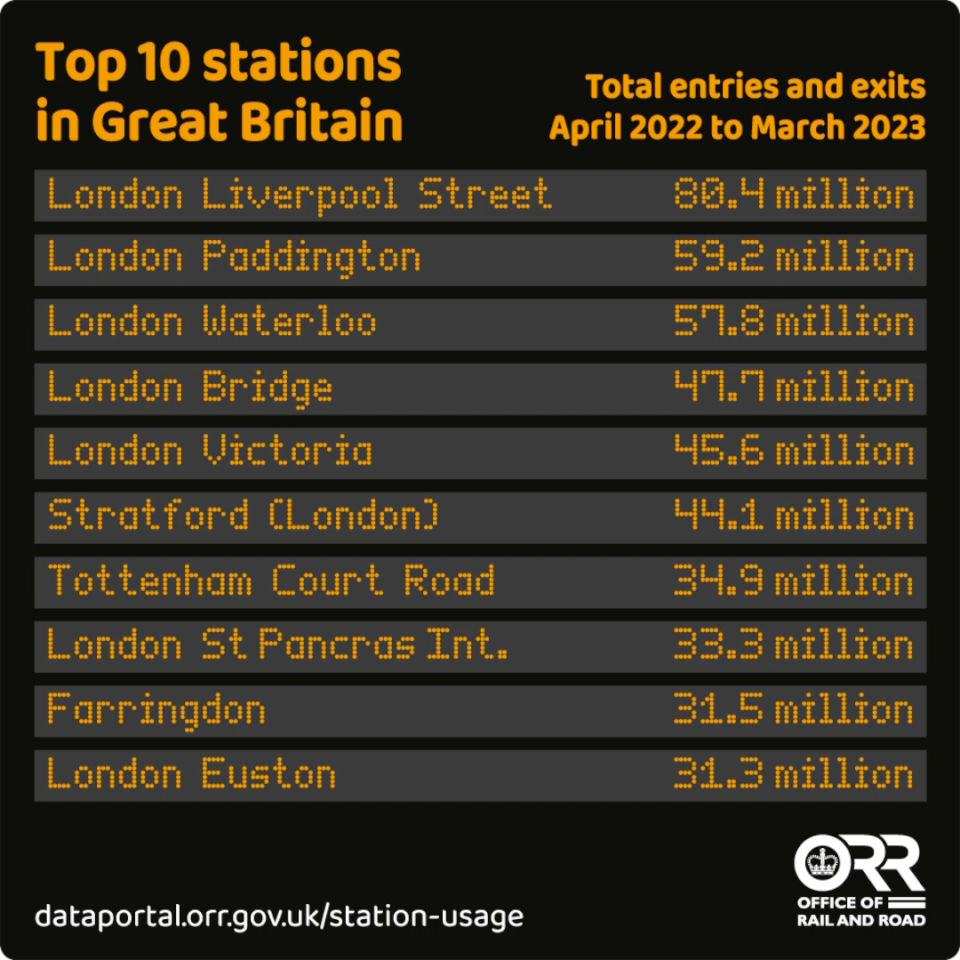 A shake-up in the Office for Rail and Road (ORR)’s top ten busiest stations in Britain saw Liverpool Street shoot to the top, ousting Waterloo and with 80.4m passengers using the hub in the 12 months from April 2022.