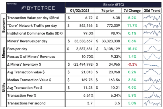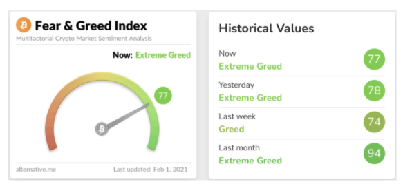 Market sentiment remains high, in Extreme Greed at 77. The index has only been outside Greed twice in the last three months. This level of sentiment for this length of time is highly unusual and would usually mean a correction was due, but the index only started in 2018 and has never seen a proper bull run before.