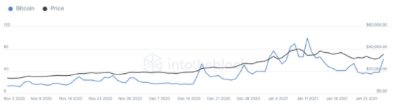 The trend in Google searches over the last 90 days. Google shows this chart on a relative basis with a max score of 100 on the day that had the most Google searches for that keyword. The latest score is 62 – taken from 29 January.