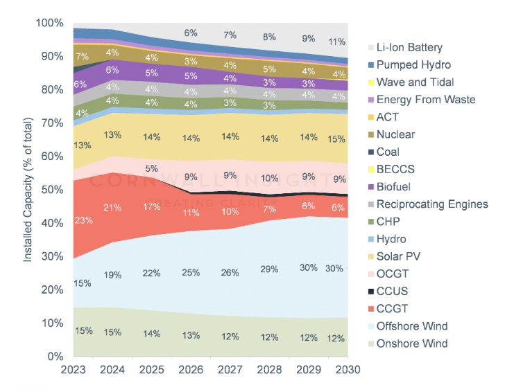 This will be helped by an increase in battery storage capacity, meaning renewable energy can be stored more effectively for use during periods of low wind and solar generation, lowering prices during these times.