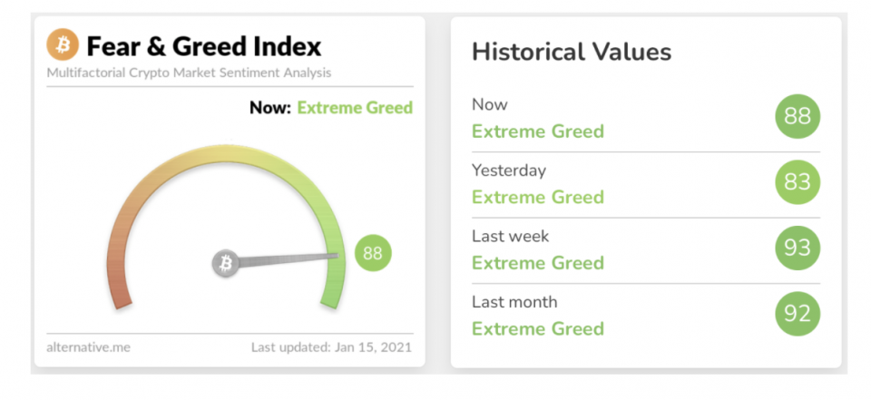 The Fear and Greed Index is back up to 88 today after a couple of days in the doldrums of slightly-lower Extreme Greed. It’s important to remember that the index doesn’t usually stay this high for very long and this could mean a correction is on the cards, so be vigilant.