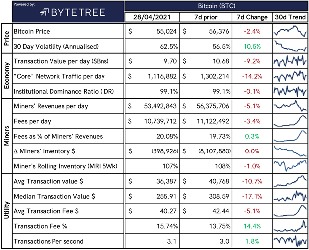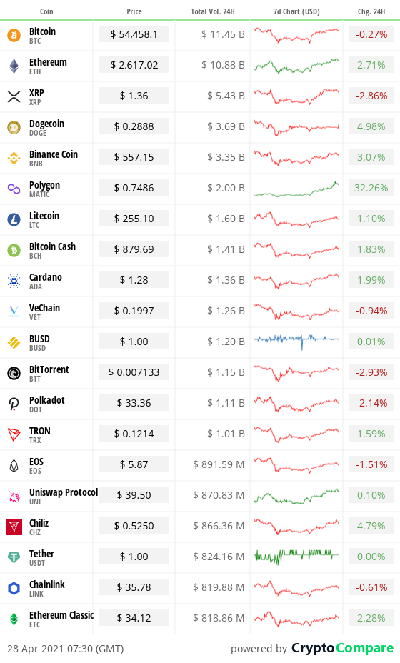 We closed yesterday, April 27 2021, at a price of $55,033.12 – up from $54,021.75 the day before.