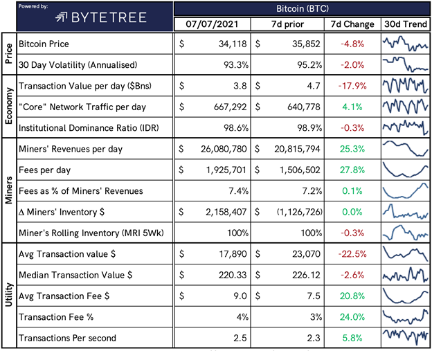 We closed yesterday, July 6 2021, at a price of $34,235.19, up from $33,746.00, the day before.